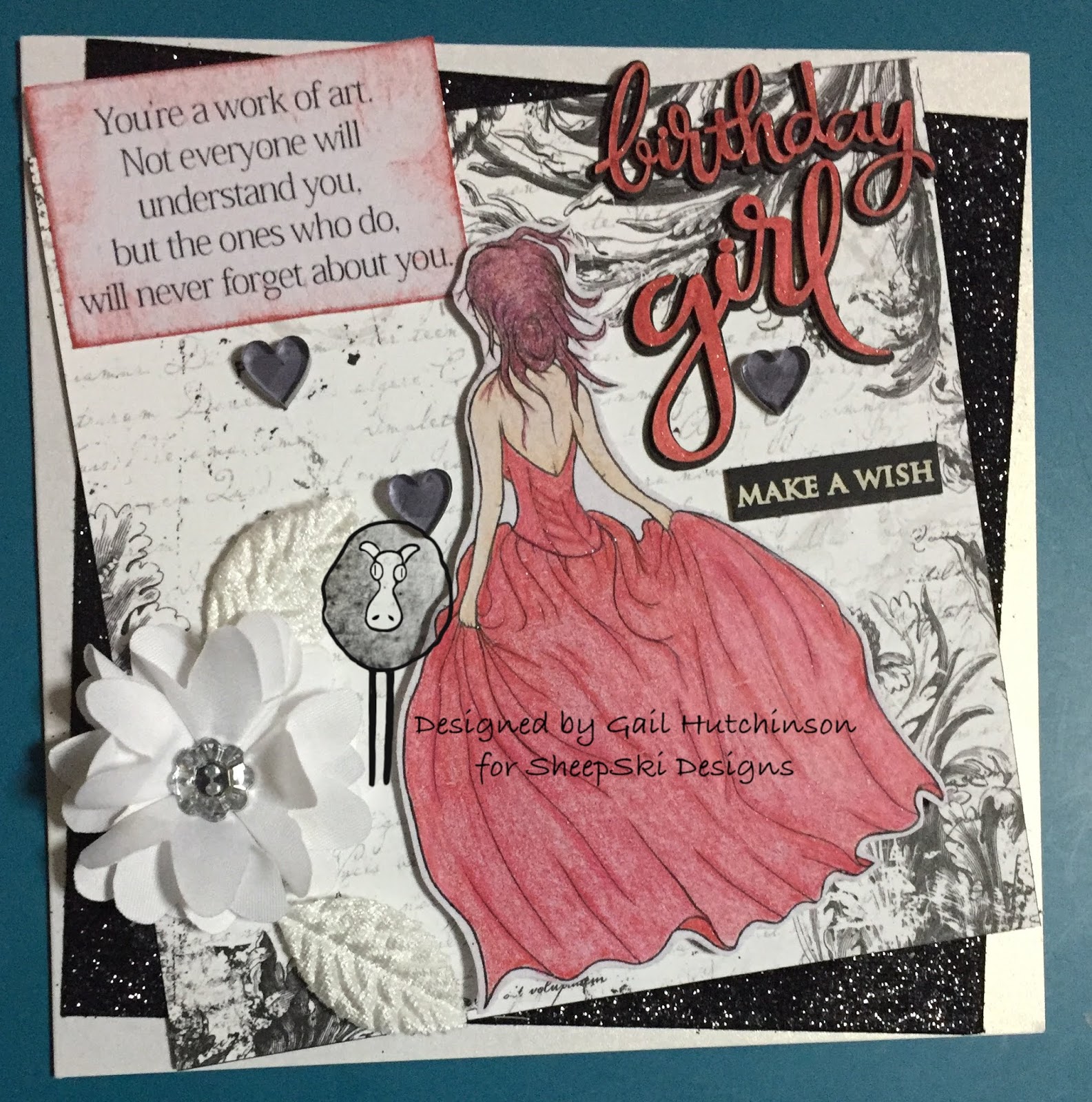 Ball Gown for my square Birthday card, coloured with pencils and of course chipboard from Make It Crafty. I am so sad Zoe is closing her business, I have been buying from her a long time and will miss her. Now back to my card. I have raised the image with double-sided foam tape. I have also decorated my card with resin hearts and leaves and a flower from my stash. The Make a Wish piece of chipboard is from Scrapmatts. Of course, I have been looking at quotes and found this one, perfect for a teenage girl's birthday card.